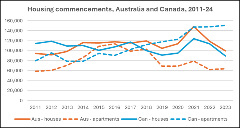 At the same time, the nature of the housing supply challenge in the early 2020s contrasts significantly across the two countries. Most notably, trends in apartment construction have markedly diverged. By 2024, such building starts had fallen by 48% from their 2016 peak in Australia, whereas Canadian unit commencements had surged by 71% over this period.